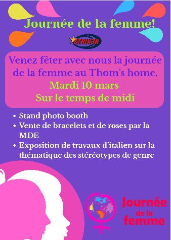 Retouvez nous le 10 mars 2026 sur le temps de midi pour célébrer la journée de la femme. Il y aura plusieurs stands comme :